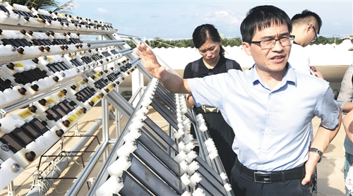 王立平研究员在实验站查看涂层防腐实验结果,并向记者介绍石墨烯防腐涂料特点。 记者 佘惠敏摄