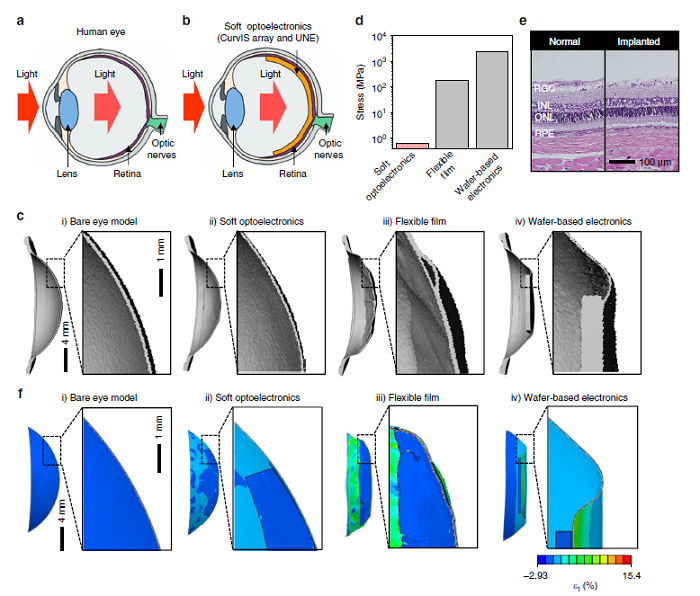 e 正常视网膜和植入软光电子器件视网膜的染色组织图片;