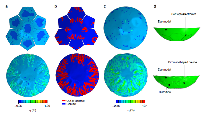 c 由软光电子器件(顶部)和圆形器件(底部)连接的眼模型中的最大面内主应变分布;