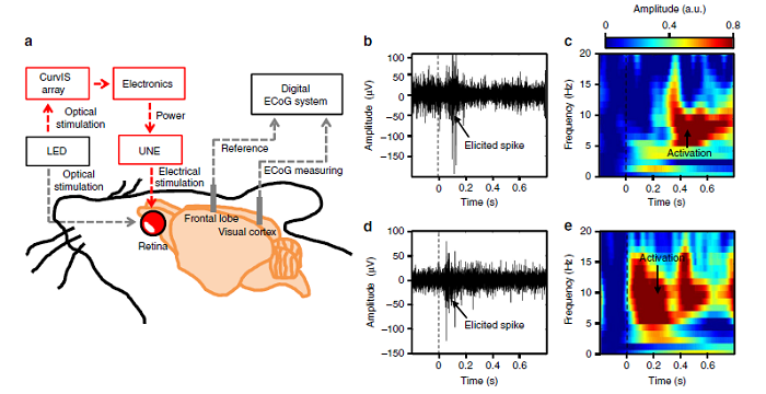a 用于刺激视网膜(左)和从视觉皮层(右)记录神经信号的实验装置的示意图;