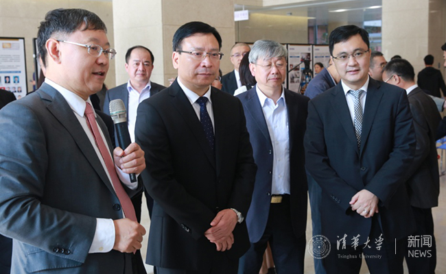 康飞宇(左一)张林(右一)陪同陈如桂(左二)参观科研成果展示