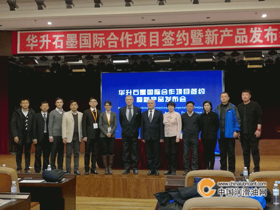 活动当天,鹤岗市政府副市长于志远和曼彻斯特大学苏兰•巴格女士共同为“英国曼彻斯特大学-黑龙江省华升石墨股份有限公司二维材料在储能领域应用联合实验室”合作项目揭牌;华升公司董事长单永宝和上海交通大学胡南滔教授为“上海交通大学教育部重点实验室-黑龙江省华升石墨股份有限公司石墨烯制备技术产学研合作基地”合作项目揭牌。鹤岗市委副书记、市政府市长王秋实等领导负责人发表了致辞;苏兰•巴格女士和胡南滔教授就本次合作项目进行了相关介绍;俄罗斯石墨烯专家谢柳金教授、华升公司技术总监曹殿学教授则对本次会议的另一大重头戏——“朗丰”牌高性能石墨烯润滑油的全新上市进行了重点推介。