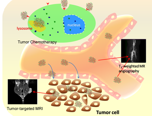 传统石墨烯基磁共振纳米诊疗剂存在两个问题,一是石墨烯二维材料尺寸较大,在活体中滞留时间较长,难以代谢,对活体器官造成潜在危害;二是接枝钆螯合物效率低,磁共振成像效果差,难以发现微小肿瘤。基于此,吴正岩研究组利用化学手段将氧化石墨烯裁剪成80-100nm尺寸的纳米片,使氧化石墨烯在活体内具有合适的滞留时间,且易于代谢出体外;同时,将裁剪后的氧化石墨烯与金属化的树状高分子接枝,提高氧化石墨烯表面钆螯合物含量,使磁共振成像效果显著提高。在小鼠体内实验结果表明,该纳米诊疗剂能够显著提高肿瘤组织对比度,增加肿瘤组织检测敏感度,对肿瘤展现很好的抑制作用,提高肿瘤的治疗效率。此外,该纳米诊疗剂具有很好的血管造影功能,为心血管疾病的诊断提供了积极思路。