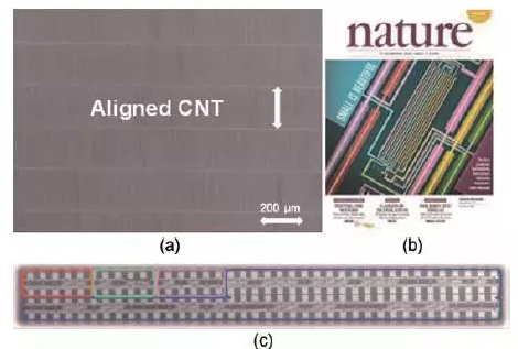 斯坦福大学研究组采用如(a)所示的碳纳米管阵列制备出了如(b)所示的世界上第一个碳纳米管计算机;(c)主要功能单元的扫描电子显微镜像