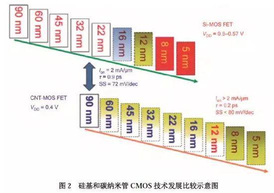 Science杂志于2013年发表了美国斯坦福大学的研究人员采用178个碳纳米管晶体管制造出的的计算机原型。MIT Technology Review于2014年报道了美国IBM公司表示将在2020年之前利用碳纳米管制备出比现有芯片快5倍的半导体芯片。美国IBM公司于相关媒体发表的结果表明,基于碳纳米管的半导体芯片在性能和能耗方面都比传统硅基芯片有显著改善:硅基半导体技术从7 nm缩减到5 nm节点,相应的芯片性能大约有20%的增加,而7 nm技术节点下的碳基半导体技术比硅基7 nm的性能提高300%,相当15代硅基技术的改善。这些进展使半导体产业界看到了碳基电子学时代的曙光,有望将性能持续提高的摩尔定律延续到2050年。