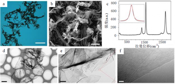 气泡CVD法制备得到的石墨烯的表征:(a)载玻片上提纯过后的石墨烯的光学显微镜图片;(b)纯净石墨烯的扫描电子显微镜图片;(c)石墨烯的拉曼光谱图.插图为石墨烯2D峰的洛伦兹拟合结果;(d-f)纯净石墨烯的透射电镜图片.图a和b中的标尺分别为5微米和100微米,d-f中的标尺分别为1微米、200nm、5nm。
