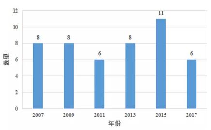 图1 2007-2017年新增石墨烯相关研究的两院院士数量分布