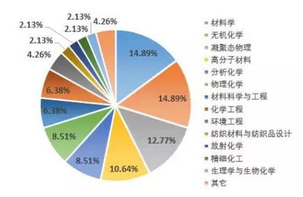 研究数据表明,近十年新增从事或涉及石墨烯研究的两院院士主要集中在中国科学院化学部(42.55%)、中国工程院化工冶金与材料工程学部(14.89%)和中国科学院数学物理学部(10.64%),其中外籍院士占比为10.64%,引进了多位石墨烯相关的国外人才。石墨烯相关研究的两院院士由化学部、化工冶金与材料工程学部和数学物理学部逐步拓展到技术科学部、环境与轻纺工程学部、信息技术科学部、生命科学和医学学部,表明石墨烯的应用领域不断拓宽,科学家的关注方向不断变化。研究石墨烯的两院院士专业主要分布在材料学、无机化学、凝聚态物理、高分子材料方向,在这四大传统研究专业方向占据了总数的53.19%,表明我国在石墨烯材料基础研究方面具有雄厚的科研实力。近年来,石墨烯在环境、纺织和生物化学等领域的研究也变得活跃起来,科学家对石墨烯的性质和应用研究方向逐步拓宽。