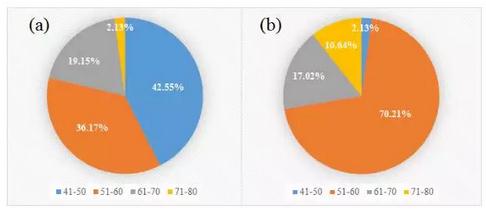 图5 近十年新增石墨烯相关两院院士年龄分布:(a)当选年龄,(b)目前年龄