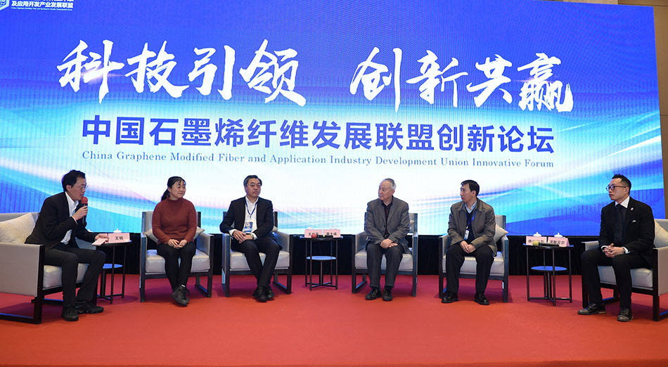 圆桌对话环节,中国工程院院士蒋士成、东华大学研究院副院长王华平、北京服装学院材料科学与工程学院院长王锐、唐山三友集团兴达化纤有限公司研发中心主任么志高、诺斯贝尔化妆品股份有限公司市场策划总监麦耀雅以“科技引领 创新共赢”为主题,围绕石墨烯改性纤维新产品、新技术的研发,如何实现上下游产业链的有机结合、加快石墨烯 改性纤维产品的应用落地和市场推广以及联盟发展等问题进行了深入探讨。