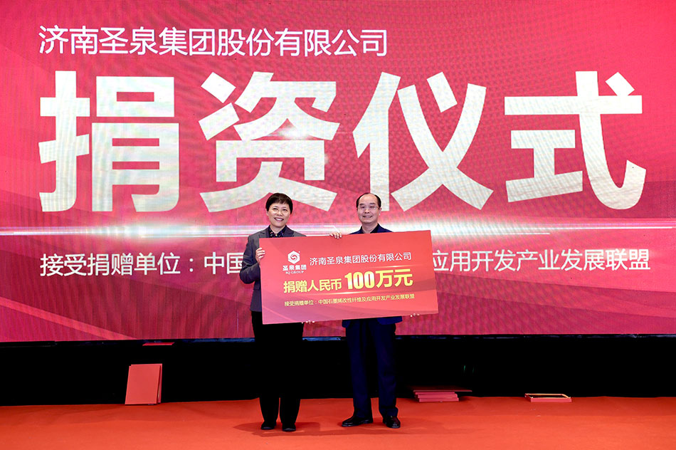 为促进联盟健康运行、联盟各项活动有序开展,本次论坛会议上圣泉集团作为联盟理事长单位,向联盟捐赠100万元人民币。圣泉集团总裁助理、奇妙科技有限公司总经理吕冬生代表圣泉集团上台捐资,联盟副理事长单位纺织工业科学技术发展中心主任彭燕丽代表联盟接受捐资。论坛上还表彰了联盟先进成员单位,颁发了2017年度最佳市场创新奖、2017年度最佳应用创新奖、2017年度产学研创新促进奖、2017年度杰出贡献奖等奖项。