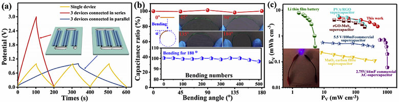 图2. 杂化石墨烯纤维制备得到超级电容器的串并联性(a)、弯曲测试(b)及其Ragone图(c)