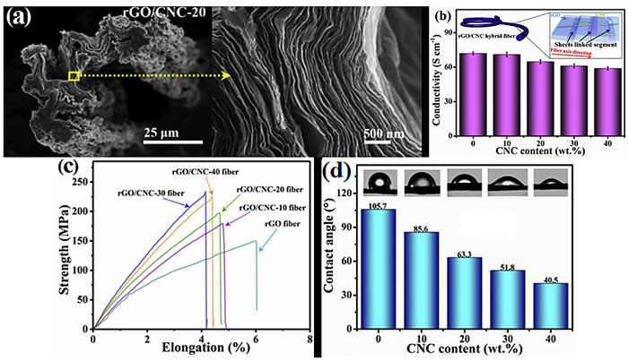 近期,该团队在前期的工作基础上,利用纤维素纳米晶具有一维棒状刚性结构、表面富含亲水性基团的特点,将其作为纳米增强单元,通过上述纺丝方法,结合化学还原获得了多组分异质组装的rGO/CNC杂化纤维。研究发现,该策略获得的石墨烯杂化纤维具有多方面优势:第一,CNC的纳米棒状形态不仅能够与石墨烯片层形成插层结构,改善石墨烯纤维中石墨烯片层堆积严重的现象,而且还能抑制石墨烯片层在纤维成形过程中可能存在的弯曲和折叠,使其在纤维轴向上排列,从而形成有序的纳米孔道结构(如图1a所示),为电解质传输提供畅通无阻的纳米通道;第二,由于自身的刚性结构,CNC不会在石墨烯片层表面形成如同高分子链包覆的状态,在增强其性能的同时,维持石墨烯片层在纤维轴向的有效连接,保证杂化石墨烯纤维的高导电性(如图1b所示);第三,CNC表面丰富的亲水性基团不仅能与石墨烯片层表面残留的含氧官能团(羟基、羧基、碳基等)形成强作用的氢键网络,有效增强其力学性(如图1c所示),而且其亲水性纳米单元能赋予石墨烯高亲水性(如图1d所示),有效提高纤维与电解质溶液的亲和性。