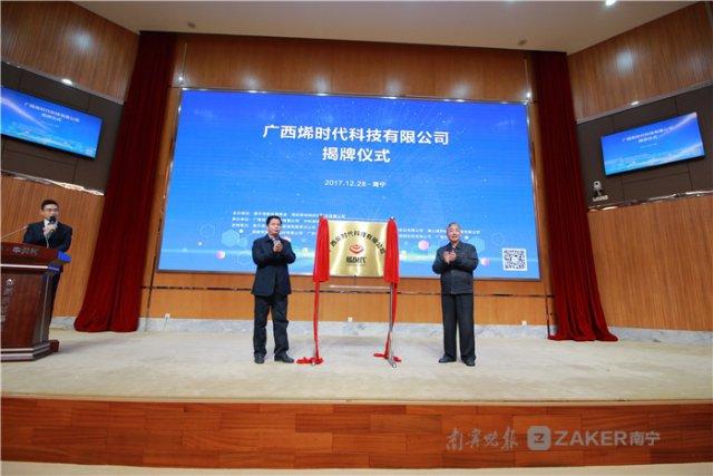 12 月 28 日上午,广西烯时代科技有限公司在南宁 · 中关村创新示范基地揭牌,这标志着战略性新兴产业石墨烯项目正式落户南宁高新区。自治区人民政府常务副主席蓝天立、烯旺新材料科技股份有限公司董事长冯冠平、自治区投促局党委书记黄文标、南宁市副市长朱会东、南宁高新区管委会主任李耕等领导出席活动。