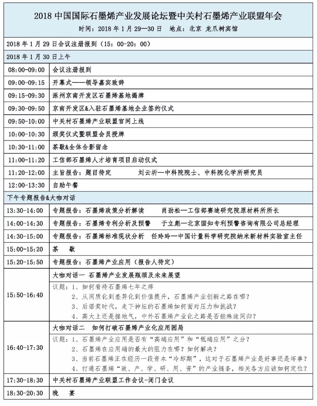 中关村石墨烯产业联盟、中关村发展集团和涿州市政府将于1月29-30日共同组织召开“2018中国国际石墨烯产业发展论坛暨中关村石墨烯产业联盟年会”。论坛以“合作创新,携手共赢”为主题,将邀请相关领导、石墨烯领域权威专家学者和产业界精英共聚一堂,深度探讨现阶段石墨烯产业发展面临的机遇、挑战和前景。