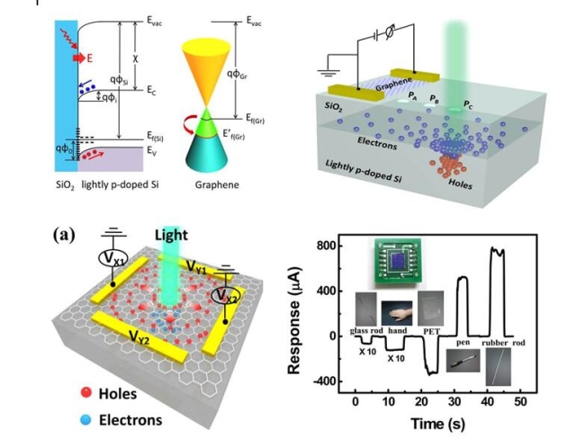 倪振华课题组提出了全新的界面态光增益机制,构建了石墨烯/二氧化硅/轻掺杂硅这一器件结构,利用轻掺杂Si中较长的载流子寿命和石墨烯的超高载流子迁移率,获得了约10的四次方的光电导增益,实现了弱光的快速、高灵敏探测,器件响应度达到1000A/W,响应时间低至400ns(Optica 3, 1066-1070 (2016))。进一步,课题组利用该界面态光增益机制以及载流子的横向扩散效应, 设计了基于石墨烯的新型PSD,实现了纳瓦(nW)量级微弱光的快速位置探测,将常规Si基PSD的极限探测功率提升了近3个数量级,且具有小于1µm的位置分辨率,并展示了一维和二维位置传感功能(Light: Science & Applications 6, e17113 (2017))。