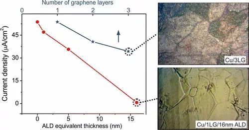 不过,随后也有研究者反驳上述观点。台湾中正大学谢雅萍(Ya-Ping Hsieh)等人也在ACS Nano 上发表论文,称化学气相沉积生长的石墨烯的纳米结构缺陷是导致腐蚀效应的主要原因。通过原子层沉积(ALD)可以减少缺陷,实现99%以上的腐蚀防护。