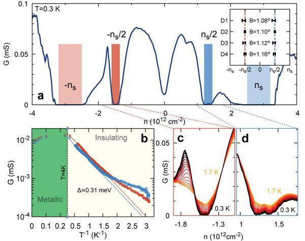 (a)用1.08°测量魔角TwBLG器件D1的电导,插图显示了四种不同器件中半填充绝缘相(HFIP)的密度位置;