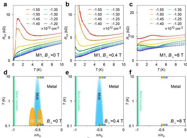 (a-c)分别在B⊥= 0,B⊥= 0.4T和Bperp = 8T下测量的不同密度的器件M1的Rxx-T曲线;