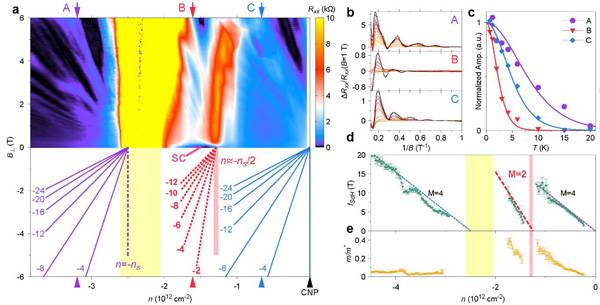 (b)(a)中由A,B和C标记的电荷密度的温度依赖性量子振荡迹线;