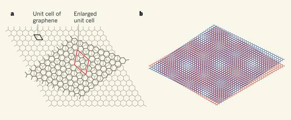 (a)当石墨烯双层被扭曲使得顶层片材与下层片材不对齐时,单位晶胞变大;