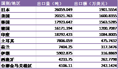 2017年中国鳞片天然石墨出口额前10名的国家或地区