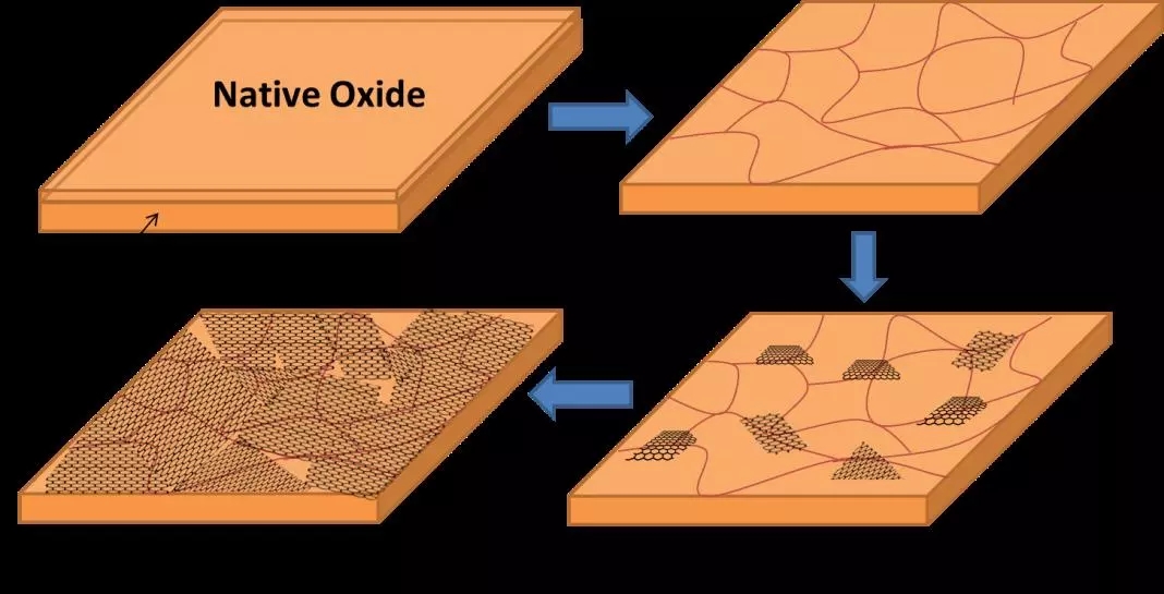 该技术采用的基本生长原理被称之为“进化选择生长”(Evolutionary selection growth)。”该研究的主导人之一、ORNL的Ivan Vlassiouk教授表示:“这是因为(大尺寸单晶)消除了多晶石墨烯中各个畴之间互连所产生的薄弱点。”最终生长最快的晶粒占据主导地位,得到高品质的单晶石墨烯。