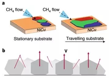 CVD生长主要依靠前驱碳氢化合物气体(甲烷、乙烷等)裂解产生碳原子,并在合适的基底表面生长得到石墨烯。一般来说,大面积单晶石墨烯的制备,往往需要高品质的单晶作为基底材料,然后进行外延异质生长。