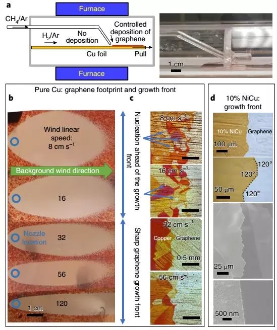基于该原理,研究人员发展了一种易于拓展成卷对卷形式的CVD量产装置:H2/Ar混合气体正常通入炉内,CH4/Ar混合前驱气体以小尺寸喷嘴的形式对准Cu/Ni基底,整体温度保持在1000℃以上。基底以1-2 cm s-1的速度均匀移动。
