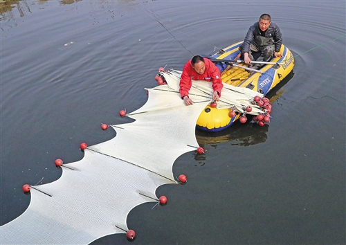 3月30日,山东东营市东营区辛店街道环保工人正在维护石墨烯网。新型石墨烯网是一种石墨烯掺杂光催化纳米半导体片状材料,能在可见光照射下,分解有机物,降解河流中重金属,起到提升净化水质的效果。 崔丽英摄
