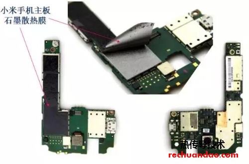 小米手机主板PCB上的CPU/Flash芯片产生的热量经过石墨膜均匀传递到中间的金属钢托及框架,同时把CPU高发热芯片的热量迅速平均到整个石墨膜的平面.