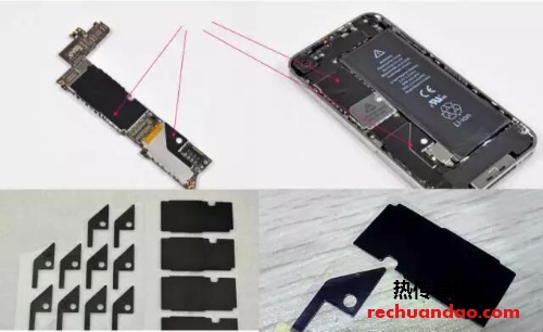 Iphone 4 智能手机PCB屏蔽罩石墨膜主要把热量均布在PCB主板,避免局部热点和避免芯片超过工作温度范围避免死机的情况.