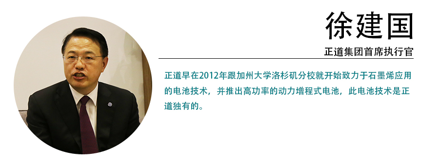 徐建国:我们的电池叫石墨烯超级电池。当然坦率的讲,石墨烯电池这个概念已经被滥用了。正道从2012年开始致力于研究石墨烯,并将其用于电池开发,在全球范围内也是此研究领域最早的的公司之一。石墨烯这个概念从2010年获得诺贝尔奖之后被大家知晓,在2014-2015年之间在中国开始受到关注。事实上,正道早在2012年跟加州大学洛杉矶分校就开始致力于石墨烯应用的电池技术,原因非常简单,因为我们2008年开始进入清洁能源汽车领域之时,就意识到电池是核心中的核心,所以在早期绝大部分时间是在研发电池系统。早期的研发也走了一些弯路,因此我们在2012年开始放弃了磷酸铁锂,转而寻求更好的技术——石墨烯,并推出高功率的动力增程式电池,此电池技术是正道独有的。