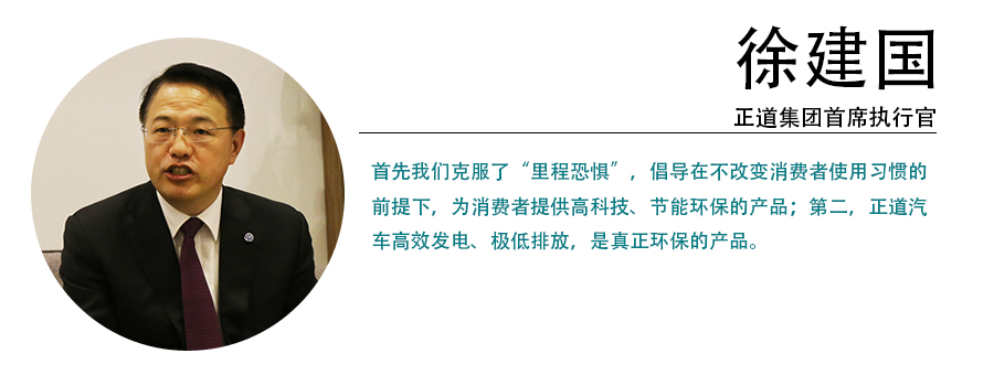 徐建国:正道集团从2008年成立以来,一直专注于清洁能源汽车解决方案的研发和整合。我们推出了生态可持续的解决方案,我们将这一产品称之为新一代基于高功率动力电池的增程式电动车,这种方案与传统的纯电动汽车有本质差别。首先我们克服了“里程恐惧”,倡导在不改变消费者使用习惯的前提下,为消费者提供高科技、节能环保的产品。正道汽车也有电池与电机,由电驱动,但是用电量较小,普通电动汽车用80度电、100度电,甚至是120度电,而我们只需20度电。这得益于我们节能环保的发电机,它的排放只有传统的内燃机的十分之一,如果你采用氢燃料电池作为发动机的话基本上可以实现零排放。而它最大的好处在于消除了里程恐惧,优化了资源配置。众所周知,贵金属锂价格昂贵,生产和回收的过程都是高污染的。此外对消费者而言,平时上下班只有40公里、50公里,只需10度电、20度电就够了,如果把100度电的电池放在车上而不用,当需要用的时候又不够,就产生了里程恐惧。第二,其实纯电动车是不环保的。纯电动只是把污染从北京、上海转移到山西、内蒙如此而已。只有当清洁能源的比例占到50%以上,才可能做到环保的纯电动汽车。正道汽车高效发电、极低排放,为消费者带来了极大的好处,对社会这也是一款节能环保的优秀汽车产品。我们从2008年开始坚持这种技术理念,而实践证明这一理念也越来越被市场所认可。
