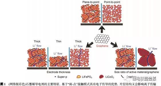 除自身的物理性质(良好的电子电导率)及结构 (平面二维)特点外, 石墨烯导电剂的高效性还跟其与活性材料颗粒独特的接触模式有关. 本课题组率先提出如图2的石墨烯柔性“面-点”接触导电网络机理图.。