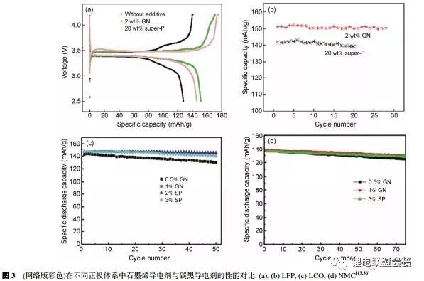 考虑到不同锂离子电池正极体系的特性有差别, 对于导电剂的需求量也不尽相同, 本课题组针对不同锂离子电池正极体系(包括LFP, LCO, NCM)系统考察了石墨烯导电剂在实验室工况下的最优使用量, 并与使用其他导电剂进行了对比, 探讨了基于“面- 点”接触模式石墨烯导电剂具有的优势.