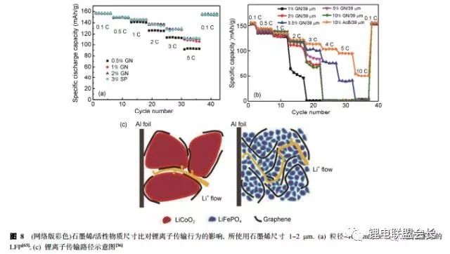 当用于高功率放电的动力电池时,电极片不能太厚; 同时也可以通过碳黑/石墨烯二元导电剂和导电剂的多孔化和条带化来保证电子导电性的同时适当减少石墨烯的用量. 而对于能量型的LFP电池, 由于工作电流并不大, 电极厚度可以适当放宽, 也与能量型电池通常具有较厚电极的设计思路一致. 而对于LCO等颗粒尺寸较大的锂离子电池, 石墨烯对锂离子传输过程影响有限,这种情形下使用石墨烯导电剂, 既可以提高电池的能量密度, 同时还可以保证电池的功率 性能.