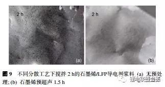 将石墨烯导电剂进行超声预处理,可以显著提高石墨烯导电剂的分散效果. 如图9所示,如果没有对石墨烯作任何预处理,仅通过行星式真空搅拌机搅拌分散2h后,浆料表面仍然可以观察到非常明显的石墨烯团聚块, 证明石墨烯并没有很好地分散在正极体系中.如果预先将石墨烯放置在N-甲基吡咯 烷酮(NMP)中强超声处理1.5h之后再进行搅拌, 2h后发现相较于未经任何处理的情况, 石墨烯可以很好地分散在浆料里.