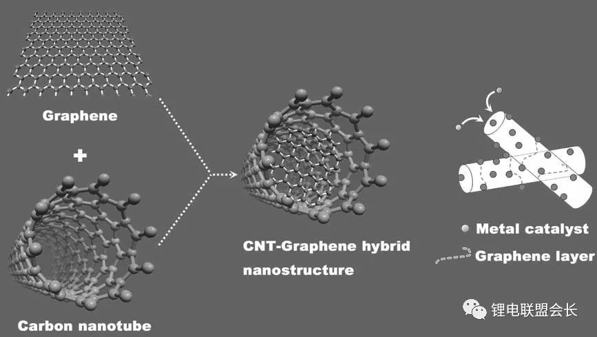 Wang课题组比较了1%的碳纳米管与石墨烯对LFP的导电效果,同样发现使用碳纳米管时LFP的电化学性能不及使用石墨烯的情况. 为了解决碳纳米管的分散问题, Sotowa等人将碳纳米管与导电碳黑按照2:1做成了一种杂化材料,并用作LFP的导电剂.实验结果表明导电效果有一定的改善, LFP在0.2 C的放电容量从单纯使用碳纳米管时的148.6 mAh/g提升到156.1 mAh/g. 但是实验中导电剂用量为10%, 远 高于其他工作报道的5%和2%. 也有研究者比较了导电碳黑、碳纳米管和石墨烯对石墨负极的性能影响,同样得到了石墨烯导电效果最优的结论.