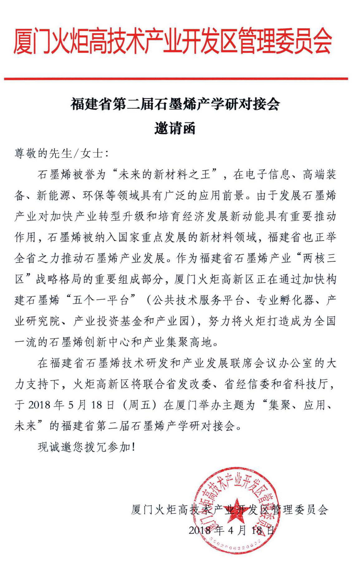 邀请函 | 福建省第二届石墨烯产学研对接会 石墨烯网 • 2018年5月8日 08:40 • 产业新闻 • 阅读 2897 在福建省石墨烯技术研发和产业发展联席会议办公室的大力支持下,火炬高新区将联合省发改委、省经信委和省科技厅,于2018年5月18日(周五)在厦门举办主题为“集聚、应用、未来”的福建省第二届石墨烯产学研对接会。 本文来自厦门创新创业园,本文观点不代表石墨烯网立场,转载请联系原作者。 福建 赞 (0) 石墨烯网 0 生成海报 首个石墨烯国际标准检测体系落户丰台园 上一篇 2018年5月8日 嘉兴市南湖区孙旭阳副区长一行来我司考察 下一篇 2018年5月8日 相关推荐 借力国际合作 石墨烯点燃福建新“烯”望 2017年7月31日 1.3K000 政策动向 福建省石墨烯产业技术创新战略联盟揭牌成立 2016年12月31日 2.3K000 产业新闻 福建闽烯科技有限公司 2019年7月10日 1.5K000 工作机会 赵猛:石墨烯应用助力农业发展 2021年6月1日 2.3K000 产业新闻 福建永安市永清石墨烯研究院招聘简章 2019年3月22日 1.9K000 工作机会 福建石墨烯产业集聚效应初显 “两核三区”产业格局加快形成 2018年8月20日 2.0K000 产业新闻 平和宇晟石墨烯科技项目试生产 本月底可投产 2019年4月15日 2.1K001 产业新闻 龙岩市两个创业项目在第四届“中国创翼” 创新创业大赛全国总决赛中获奖 2020年11月19日 1.1K000 产业新闻 第一届福建省“新烯望、新产业、新动能”石墨烯高峰论坛开幕 2017年6月19日 1.9K000 产业新闻 发表回复 请登录后评论...登录后才能评论 提交