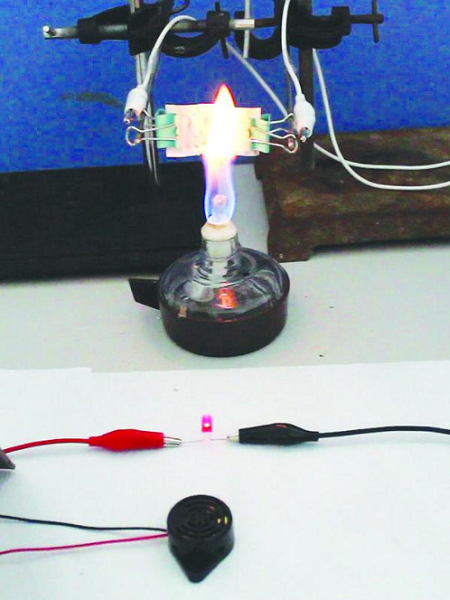 图说:新型火灾自动报警耐火壁纸在火灾发生时的快速响应(几秒钟内)与持续报警(5分钟以上)模拟实验 中科院上海硅酸盐研究所供图(下同)