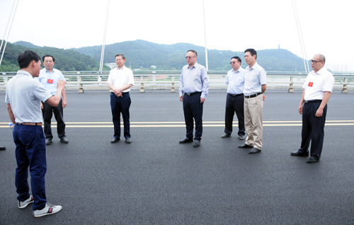 ▲广西壮族自治区政协副主席、广西大学校党委书记刘正东(左三),广西科技厅党组书记、厅长曹坤华(左四)到南宁大桥考察石墨烯复合橡胶改性沥青技术的实际运用情况。