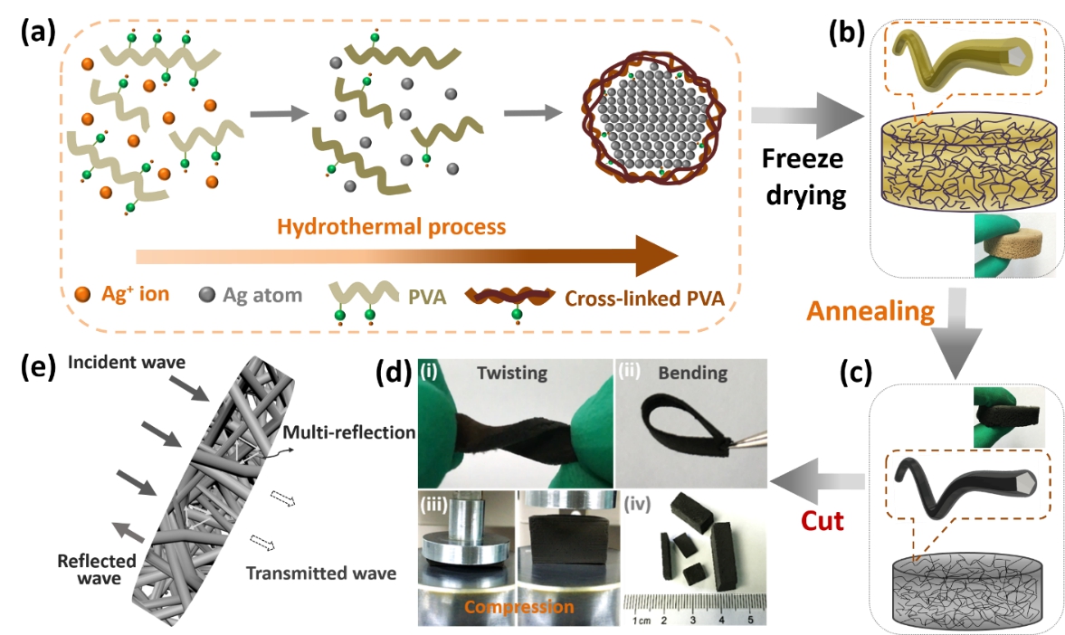 图1 高性能电磁屏蔽碳包覆银纳米线杂化海绵的制备:(a)Ag@C的制备示意图;(b)碳化前与(c)碳化后杂化海绵示意图及实物图;(d)不同形状的杂化海绵,表现出优异的力学性能;(e)杂化海绵屏蔽电磁波原理示意图。