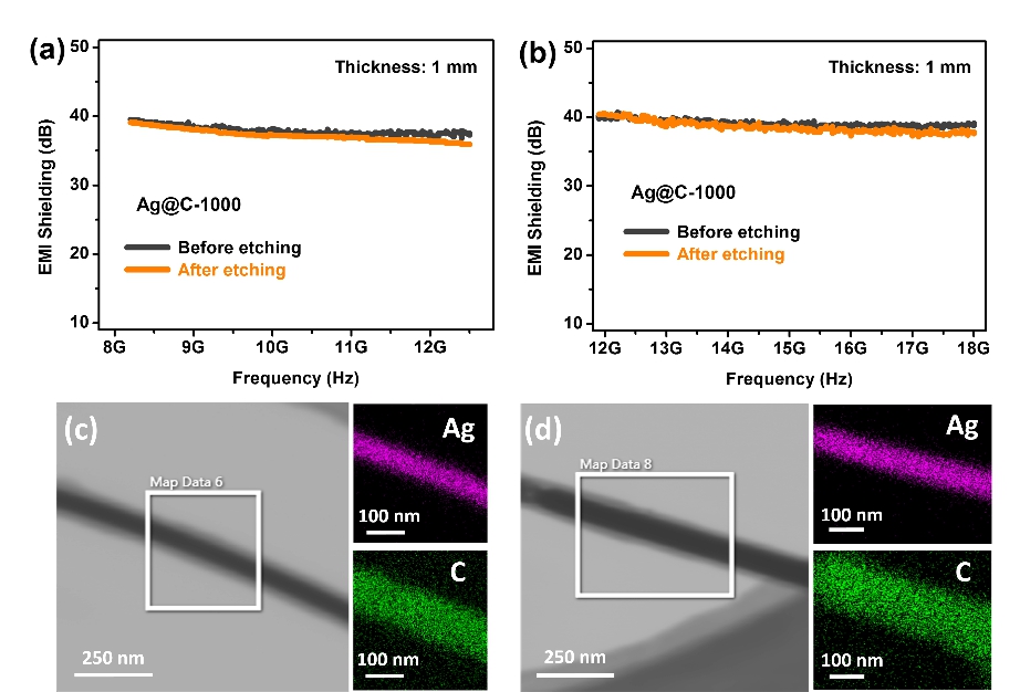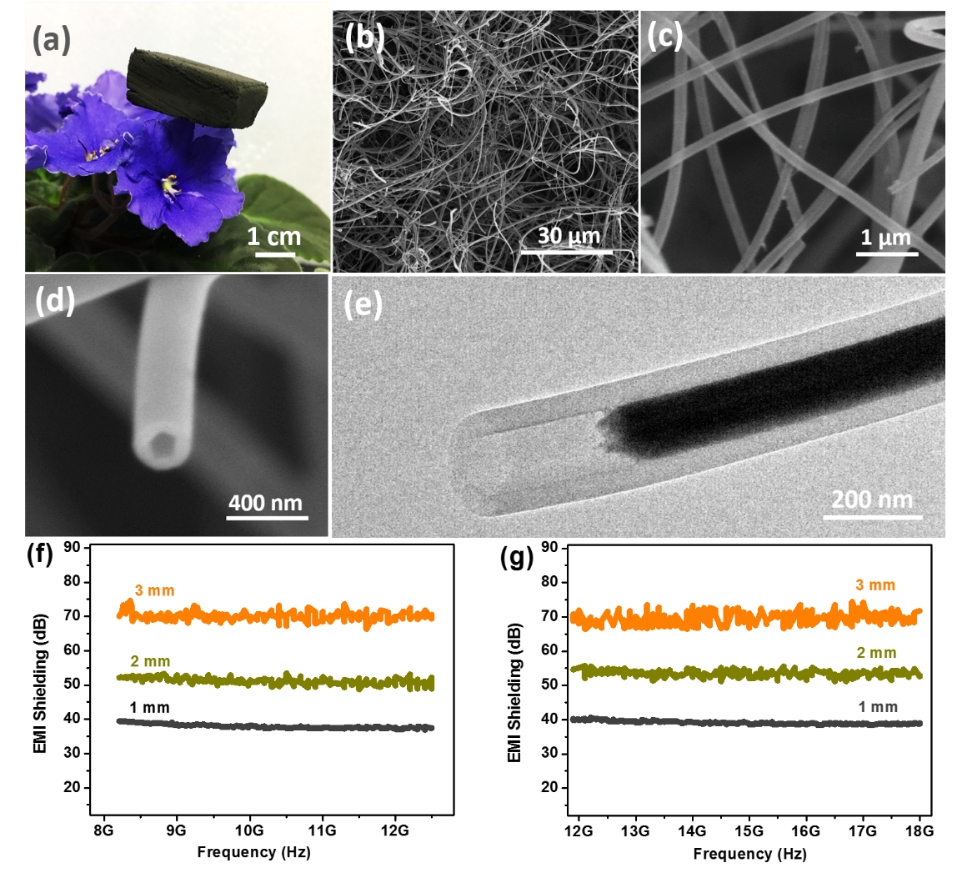 近日,香港中文大学教授廖维新,中国科学院深圳先进技术研究院汪正平、孙蓉团队在国际纳米材料期刊Small上发表了最新研究成果Anticorrosive, ultra-light and flexible carbon-wrapped metallic nanowire hybrid sponges for highly efficient electromagnetic interference shielding(《用于高性能电磁屏蔽的耐腐蚀轻质柔性碳包覆金属纳米线杂化泡棉》)。科研人员采用水热法和高温退火制备了碳包覆银纳米线杂化海绵(Ag@C),该Ag@C海绵具有超轻(极低的密度3.2 mg/cm3)、良好的力学性能(可弯折、扭曲,以及在90%压缩应变下完全回复)和优异的电磁波屏蔽性能(在X-band和Ku-band高于70 dB)。更为重要的是,由于壳层碳对银线的有效包覆及其特殊的多孔结构,Ag@C海绵表现出超疏水(水接触角158o)和优异的耐腐蚀性能(在pH=0的硝酸溶液下浸泡7天屏蔽性能无明显变化)。该杂化海绵结合了金属优异的屏蔽性能和碳材料的轻质、柔性和耐腐蚀等优点,综合性能远优于传统金属材料和普通碳材料。该工作为开发高效、轻质、柔性、耐腐蚀金属基电磁屏蔽材料提供了新的设计思路。香港中文大学博士生万艳君为论文第一作者,廖维新、孙蓉为论文的共同通讯作者,团队成员研究员朱朋莉和于淑会参与了该项研究工作。