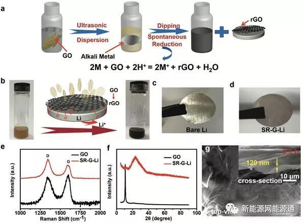 近日西北工业大学的MaohuiBai(第一作者)和Keyu Xie(通讯作者)通过采用金属Li直接还原氧化石墨烯GO的方法在金属Li的表面生成了一层还原石墨层,石墨烯层的存在能够很好的抑制Li枝晶的生长,同时稳定SEI墨提高库伦效率,石墨烯层的存在还能够显著的改善金属Li的倍率性能,实验表明该电极能够在5mA/cm2的电流密度下在LiPF6——碳酸酯类电解液中循环1000次而不发生短路。