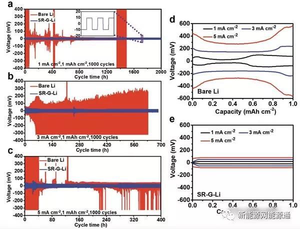 从下图d和e中我们对比在不同的电流密度下金属Li负极的电压平台能够发现,当电流密度从1mA/cm2提高到5mA/cm2,没有石墨烯涂层的金属Li负极电压平台从54.3mV大幅增大到了449.2mV,而采用石墨烯涂层保护的金属Li负极仅仅从19.2mV增加到79.3mV,表明石墨烯涂层能够显著的降低金属Li负极的极化。