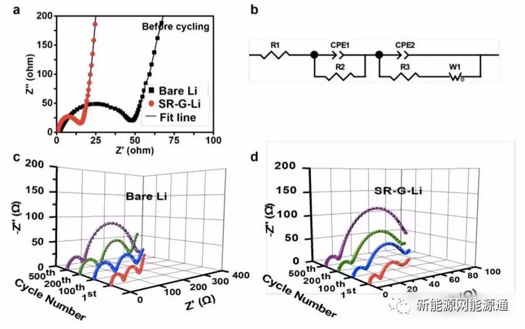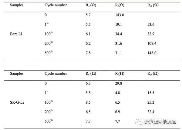 石墨涂层提升金属Li负极循环性能的原因能够从EIS分析中得到,通过对比在1mA/cm2的电流密度下循环1,100,200和500次的EIS测试结果,我们能够发现石墨烯涂层的金属Li负极表面SEI膜阻抗Rf和电荷交换阻抗RCT要明显低于没有涂层的,并且循环过程中有石墨烯涂层保护的金属Li负极的阻抗增加速度也要明显慢于普通的金属Li负极,表明石墨烯涂层能够帮助金属Li负极形成更加稳定的SEI膜,减缓循环过程中SEI膜的生长。