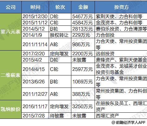 石墨烯作为全球战略型新兴行业,受到国内外政策扶持,以及各种资源及资金大量投入。就四家石墨烯上市公司而言,除了通过新三板挂牌融资外,近年来可谓融资频频。2011年以来,第六元素共进行了五轮融资,融资总额超过1.4亿元。同样的,二维碳素也进行了多次融资。