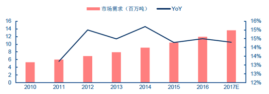 作为塑料中的高端技术产品,2009 年中国改性塑料的消费量约455 万吨,约占塑料总消费量的7%,到2016 年占比已超过10%,复合增速约14.3%,高于塑料整体的9.6%。