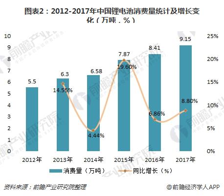 锂离子电池由索尼公司第一次商业化应用,具有电池容量大、能量密度高、自放电低、工作温度围宽的优点,在日常生活中得到了广泛的应用。数据显示,2017年,我国锂电池行业消费量达到9.15万吨,同比增长8.80%。